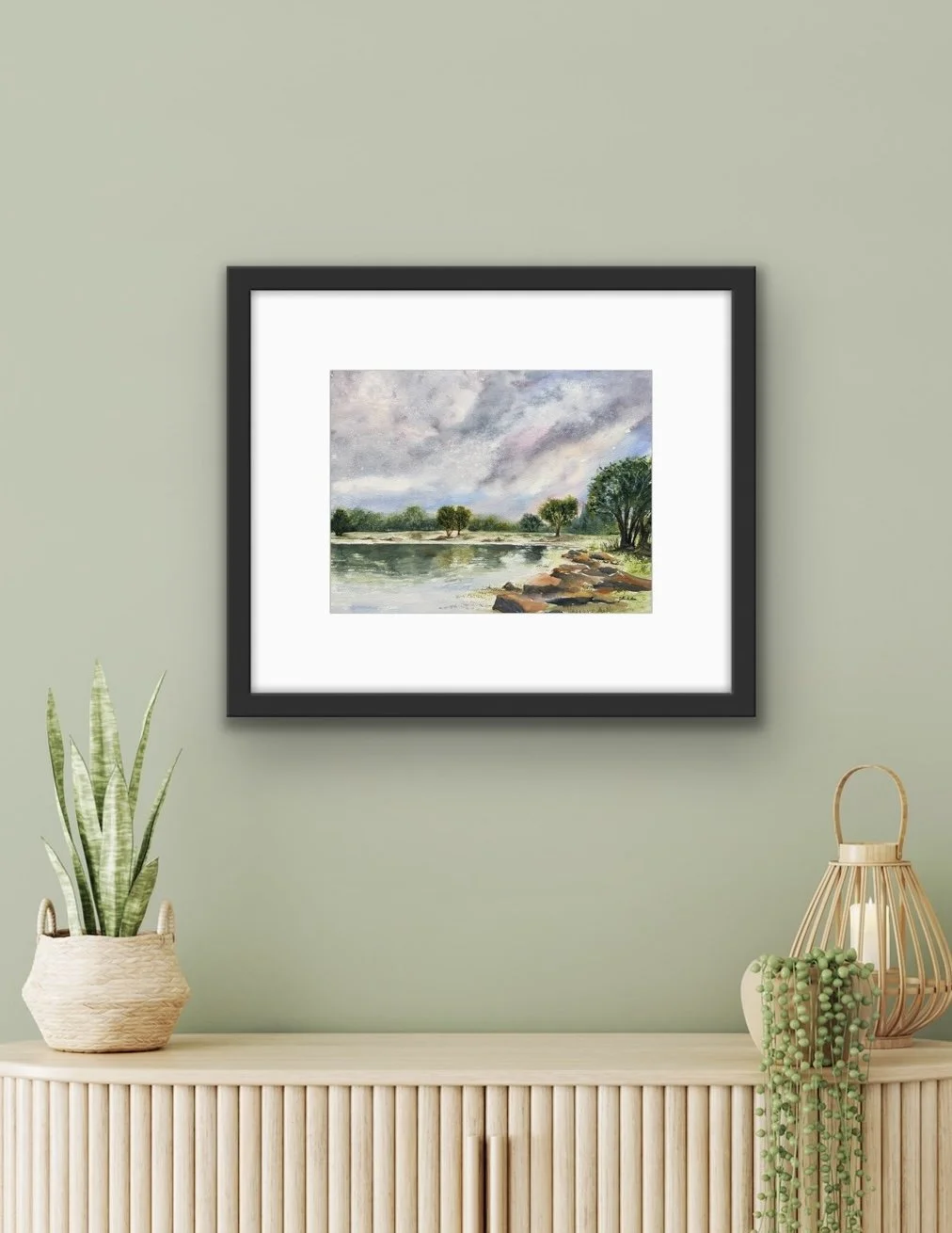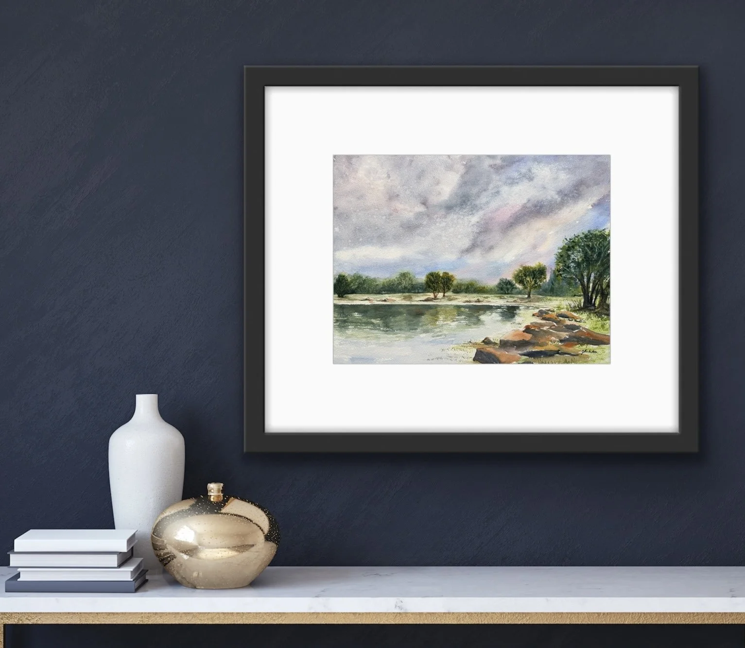 Cloud and Stone, an original watercolor painting that invites viewers into a tranquil landscape at the cusp of evening.